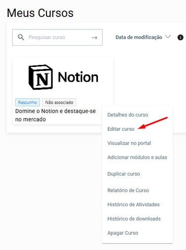 2. Clique no ícone três pontos e selecione a opção "Editar curso":