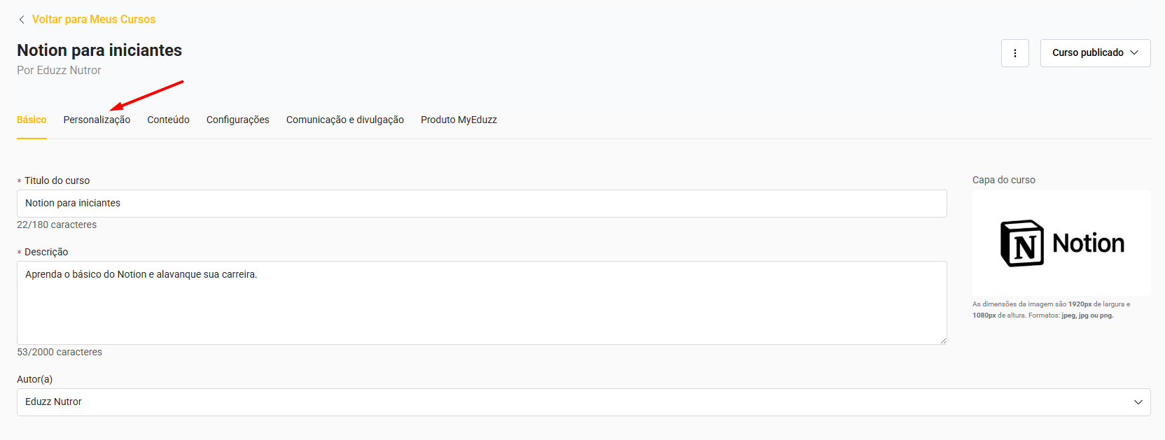 - Capa do curso: A personalização da imagem para capa do curso é obrigatória.