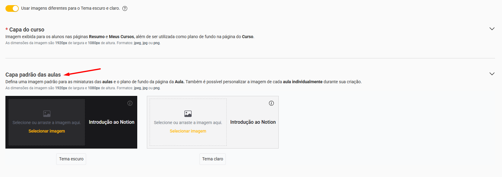 - Capa padrão das aulas: É possível personalizar uma mesma imagem para a capa de todas as aulas do curso.