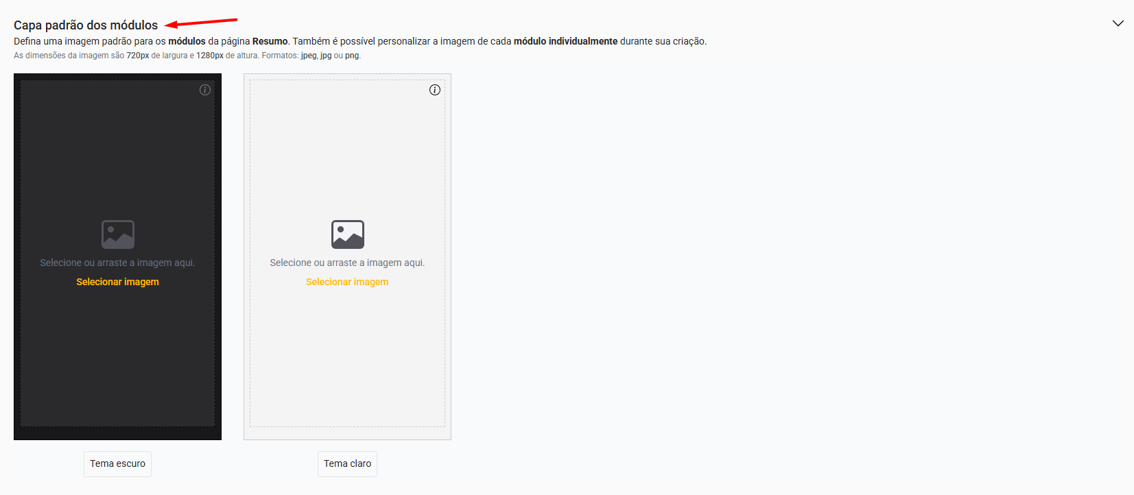 Observação: Lembre-se de prestar atenção ao tamanho das imagens suportada para cada capa. Dessa forma, você consegue garantir uma melhor qualidade de imagem para o seu curso. Para todas as capas é possível personalizar imagens diferentes nos temas escuro e claro.