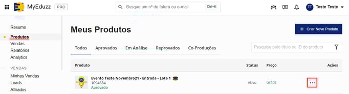 No MyEduzz, acesse o menu "Produtos" escolha o conteúdo que deseja realizar a integração e clique no símbolo com "três pontos":