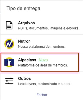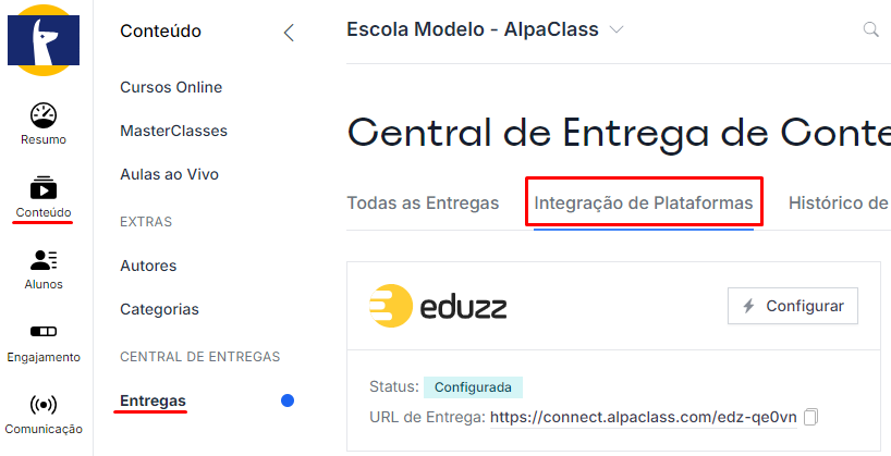 Em sua conta AlpaClass, acesse a aba "Conteúdo", clique em "Entregas" e em "Integração de Plataformas":