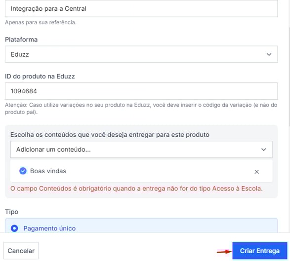 Preencha o nome, escolha a plataforma "Eduzz", cole o ID do conteúdo copiado no MyEduzz e selecione o conteúdo que será entregue. Defina também se o pagamento será único ou recorrente. Depois, clique em "Criar Entrega":