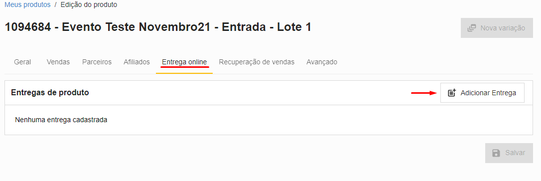 Dentro da edição do conteúdo, na aba "Entrega online" clique em "Adicionar Entrega":