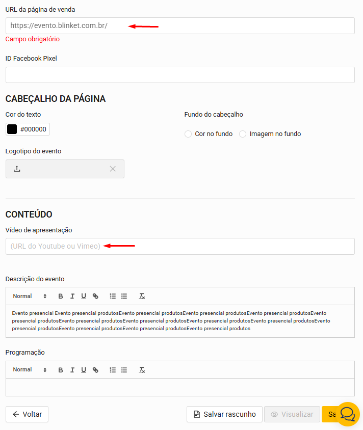 • Vídeo de apresentação: copie e cole no campo a URL de um vídeo do Youtube ou Vimeo;