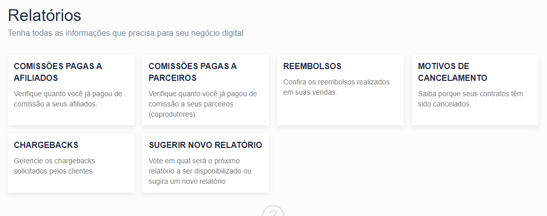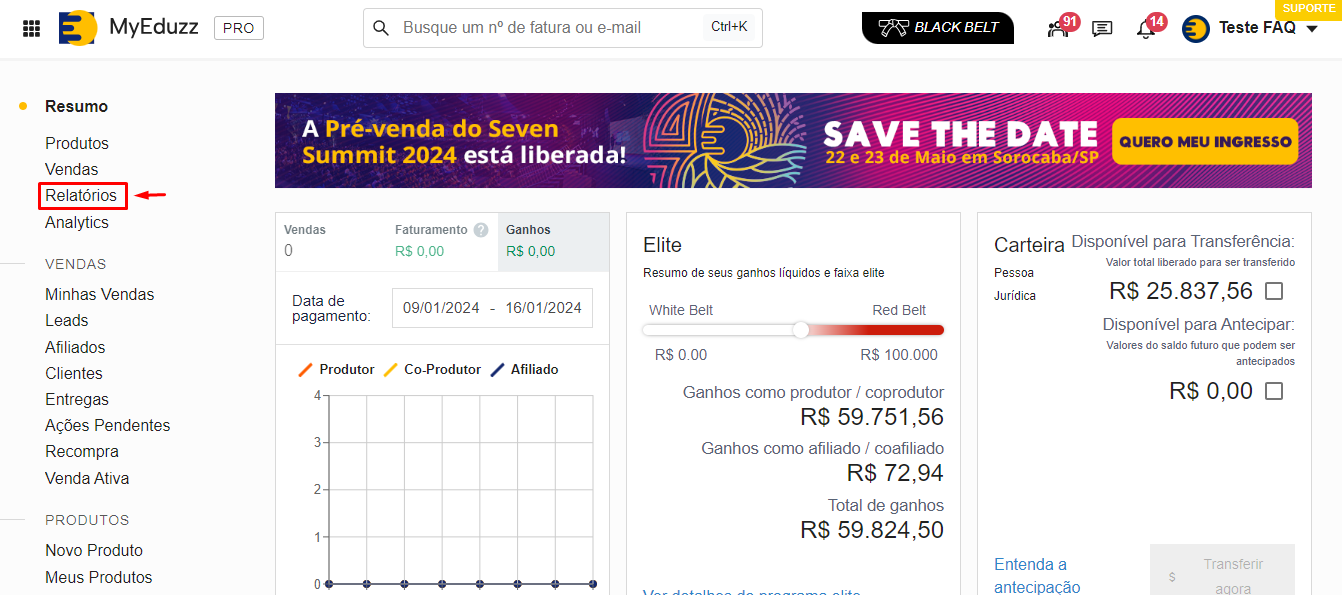 Em sua conta MyEduzz, clique no menu "Relatórios":