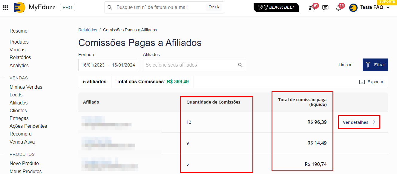 Nessa tela, você consegue visualizar o valor total das comissões recebidas por seus afiliados, além de um detalhamento individual de cada um deles.