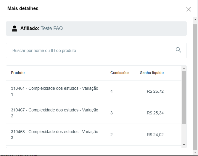 Ao clicar em "Detalhes" você pode visualizar detalhadamente a comissão do afiliado por produto: