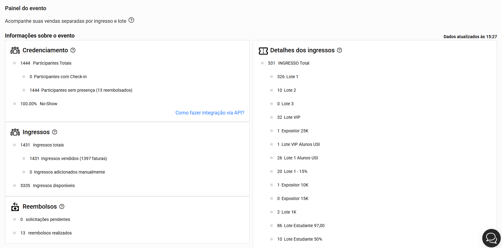 - Ingressos: mostra a quantidade total de ingressos vendidos separados por quantidade de fatura, adicionados manualmente e ingressos disponíveis;