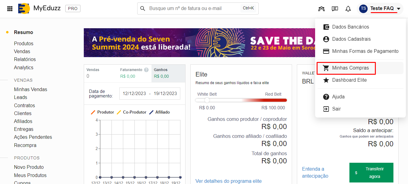 Em sua conta MyEduzz, clique em "Minhas Compras" no menu superior direito: