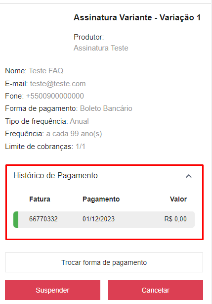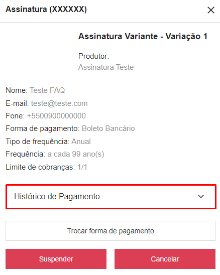 Obs: Nesse menu lateral, onde está o botão de "Histórico de Pagamento", você pode visualizar as informações gerais da sua assinatura, como número do contrato, produtor, nome, e-mail, telefone, forma de pagamento, tipo de frequência, frequência e limite de cobranças.